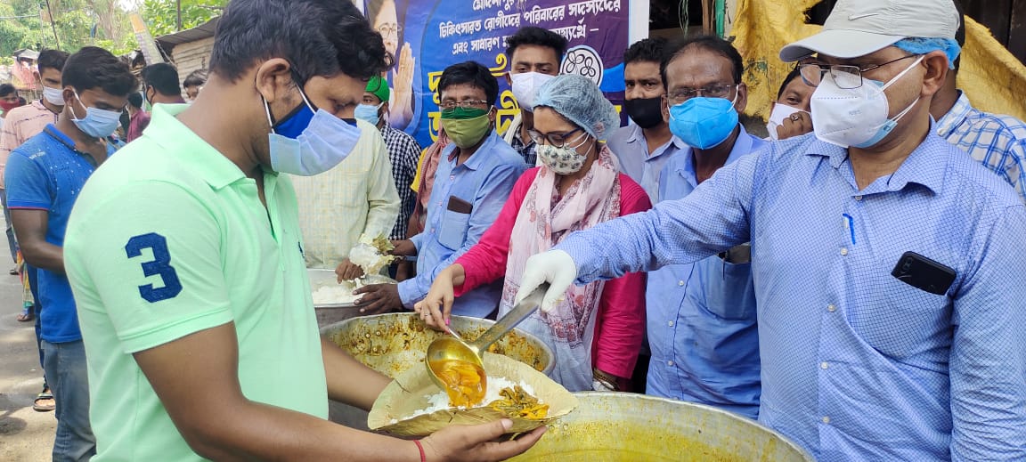 দ্য বেঙ্গল পোস্ট প্রতিবেদন, পশ্চিম মেদিনীপুর, ১৯ মে: সকাল ১০ টার পর কার্যত লকডাউন। হোটেল-খাওয়ারের দোকান সহ বন্ধ সবকিছুই। এই পরিস্থিতিতে, মেদিনীপুর মেডিক্যাল কলেজে ভর্তি রোগীর পরিজন বা আত্মীয়দের ক্ষুধা নিবারণের জন্য এগিয়ে এসেছে মেদিনীপুর শহর তৃণমূল কংগ্রেস। দূর-দূরান্ত থেকে আসা অসহায় এবং ক্ষুধার্ত মানুষজনের দুপুরের খাওয়ারে ব্যবস্থা করা হয়েছে শহর তৃণমূলের পক্ষ থেকে। ১৭ ই মে শুরু হয়েছে এই কমিউনিটি কিচেন, চলবে লকডাউনের শেষ দিন পর্যন্ত অর্থাৎ ৩০ শে মে পর্যন্ত। প্রথম ৩ দিনে প্রায় ১ হাজার ৭০০ জন মানুষ আহার গ্রহণ করেছেন শহর তৃণমূল কংগ্রেসের এই কমিউনিটি কিচেন থেকে। খুশি উদ্যোক্তারাও! আর, তৃতীয় দিনে তাঁদের কাছে উপরি পাওনা স্বয়ং মেদিনীপুরের বিধায়ক জুন মালিয়া সেই কমিউনিটি কিচেনে পৌঁছে গিয়ে, উদ্যোক্তাদের সঙ্গে হাতে হাত মিলিয়ে খাওয়ার তুলে দিলেন খাওয়ার সংগ্রহ করতে আসা রোগীর পরিজনদের। সেলিব্রেটি বিধায়কের আন্তরিকতার স্পর্শে প্রথম দু’দিনের তুলনায় এদিন আরও বেশি মানুষ খাওয়ার সংগ্রহ করতে পৌঁছে গেলেন! প্রথম ২ দিন যেখানে গড়ে ৫০০ জন করে মানুষ খাওয়ার খেয়েছিলেন, তৃতীয় দিন সেখানেই প্রায় ৭০০ জন মানুষ খাওয়ার খেয়েছেন বলে জানিয়েছেন উদ্যোক্তারা।