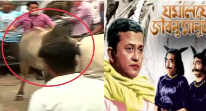 দ্য বেঙ্গল পোস্ট প্রতিবেদন, পশ্চিম মেদিনীপুর, ৩ এপ্রিল: এ যেন ভানু বন্দ্যোপাধ্যায়ের ‘যমালয়ে জীবন্ত মানুষ’ সিনেমা! ছবির নায়ক ভানু (সিধু) যমরাজকে শায়েস্তা করতে ভোলা নামক ষাঁড়কে লেলিয়ে দিয়েছিলেন! নরকে তখন রীতিমতো হুলুস্থুল কাণ্ড! প্রাণ বাঁচাতে দৌড়চ্ছে গোটা যমালয়। বাংলা সিনেমার ইতিহাসে কিংবদন্তি সেই দৃশ্যের আধুনিক দৃশ্যায়ন যেন প্রত্যক্ষ করলেন হাওড়াবাসী, তথা (মিডিয়ার দৌলতে) সারা রাজ্যের মানুষ। এদিন সালকিয়ায় মুখ্যমন্ত্রী মমতা বন্দ্যোপাধ্যায়ের রোড শো শেষ হওয়ার কিছুক্ষণ আগে, হঠাৎ মিছিলের মাঝখানে ঢুকে পড়ে একটি ষাঁড়। নিমেষের মধ্যে হুলুস্থুল বেঁধে যায়! ষাঁড় বাবাজি সিং নেড়ে তেড়ে গেল সকলের দিকে। যে যার মতো দৌড়নো শুরু করল এদিক-ওদিক! বহু কষ্টে মহাদেবের বাহনটিকে শান্ত করে র্যালি থেকে বের করলেন পুলিশ কর্মীরা। তবে, স্বয়ং মুখ্যমন্ত্রী তখন হুইল চেয়ারে অনেকটাই পিছনে ছিলেন। তাই ঘটেনি বড় কোন দুর্ঘটনা! আহত হননি কোনো কর্মী-সমর্থকই।